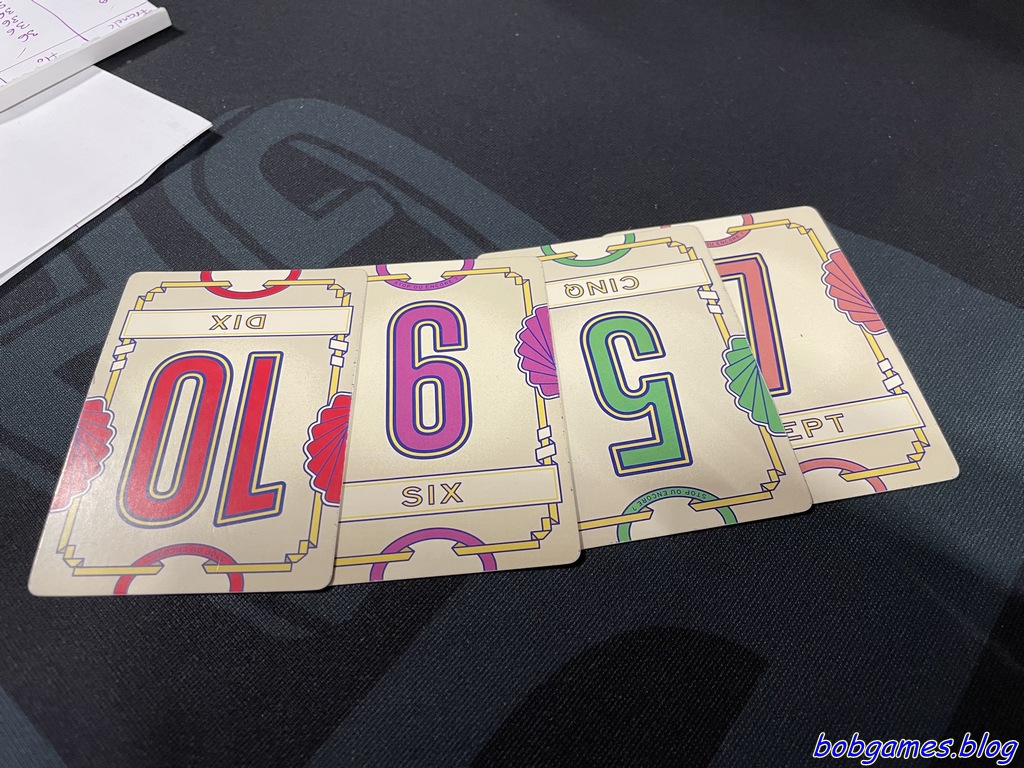 Un jeu en 3 manches. Le but est de conserver les points durement acquis. Comment les acquérir ? En gagnant des plis et en classant nos cartes par dizaines. Si 2 ou plusieurs cartes se suivent, on les élimine. On ne comptabilise en points, dans chaque colonne d’une dizaine, que l’unité la plus basse. Vous n’avez pas compris, regardez la photo ci-dessus. Comment les conserver ? En ne remportant plus de plis qui viendraient chambouler vos points durement acquis.