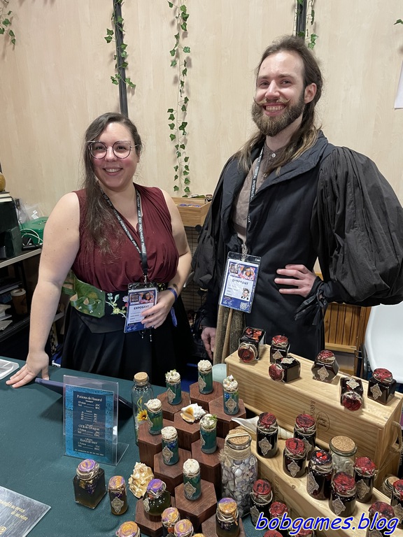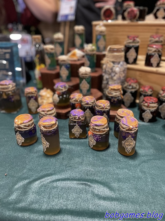 Au détour d’un stand, à l’étage des jeux de rôle, je suis tombé sur un objet qui a réveillé le rôliste en moi : une potion du hasard. Une fiole translucide qui, une fois secouée, se charge de couleurs métalliques, dorées, violettes ou autres reflets hypnotiques. Puis, quand le liquide retombe, un dé apparaît au fond, affichant son résultat. Une drôle de manière de lancer un dé, mais diablement originale. J’ai craqué. Une potion avec 2D20, parfaite pour les lancers avantagés ou désavantagés à Dungeons & Dragons. Est-ce que je l’utiliserai souvent ? Peut-être pas. Mais l’idée est belle, et l’objet magnifique. Ça valait bien un achat. Bravo à ceux qui ont imaginé ça.