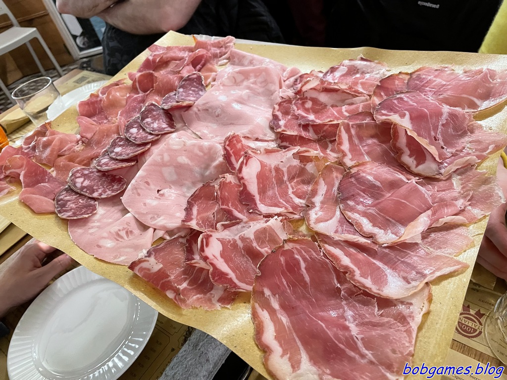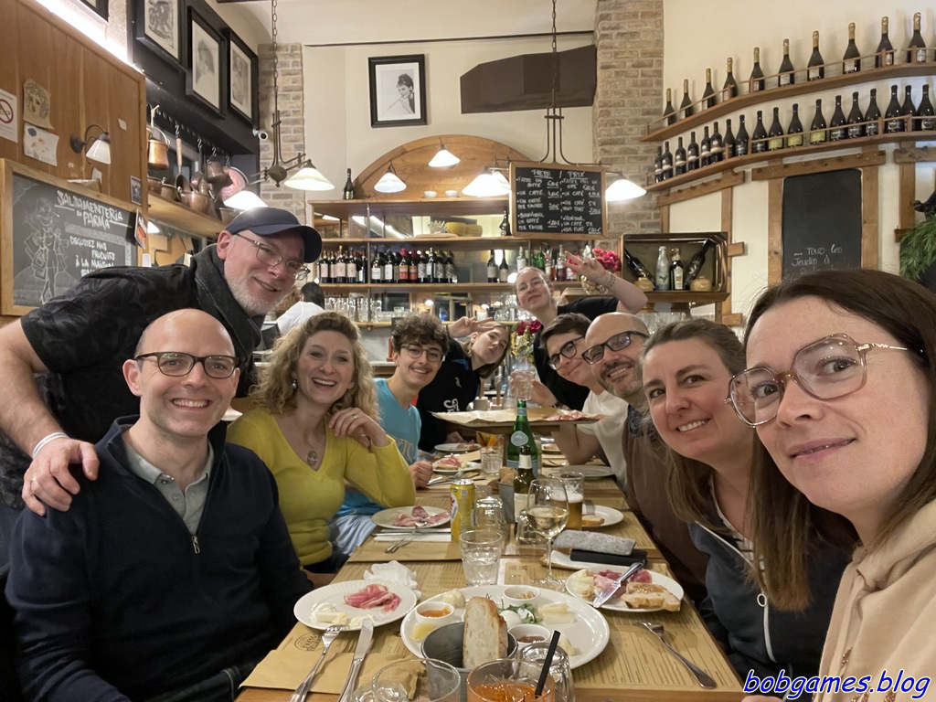 Ce qui suit n’a plus rien à voir avec le jeu mais c’est le plaisir de se retrouver tous au presque grand complet (bienvenue à Hannah et Marion !) dans un restaurant qu’on aime, la Salsamenteria di Parma.