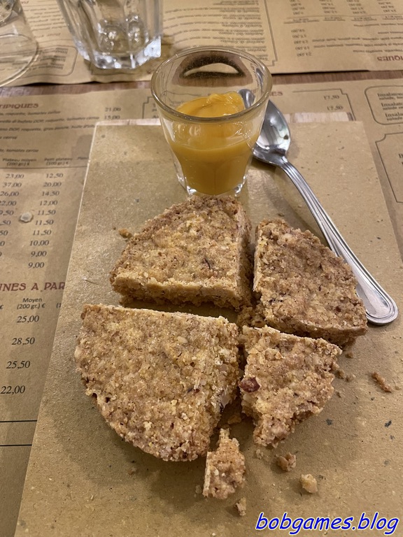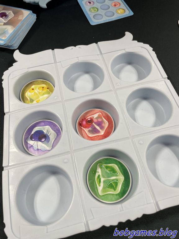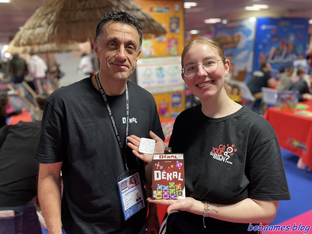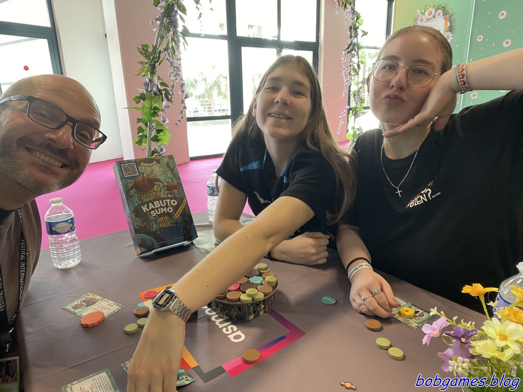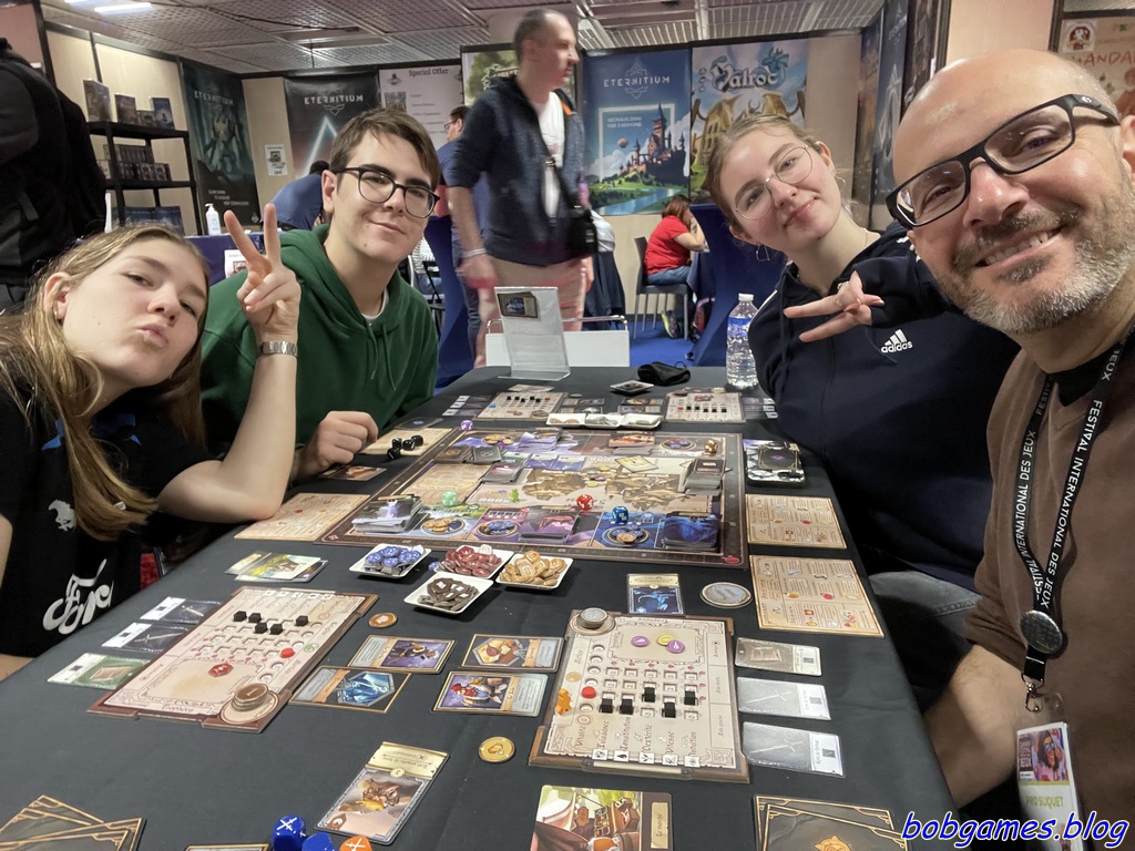 Bilan : Original et pas un jeu de plis. Parfait. C’est presque addictif et ça incite à faire travailler le cerveau pour modéliser les conséquences d’un coulissement. Autant dire qu’on a adoré ! 12 petites minutes de jeu avec les règles à 3 joueurs. Victoire de Tessa. Achat pour l’association Ça Joue ou Bien ? Meyrin avec dédicace de l’auteur !