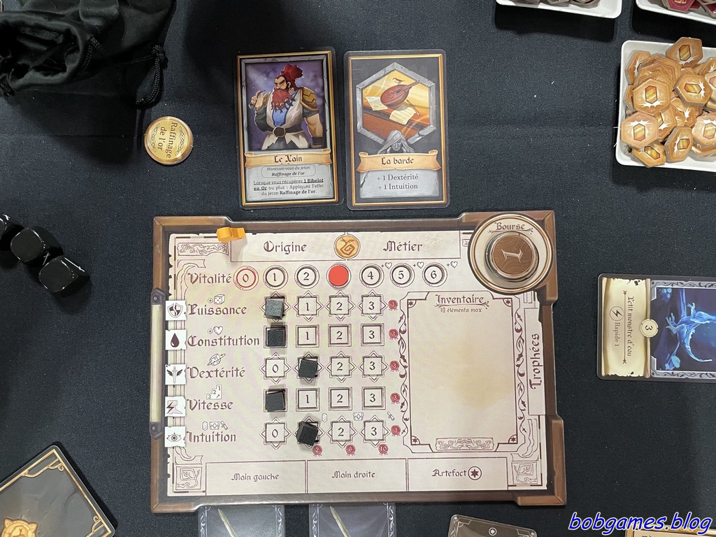 Bilan : Pour nous la partie s’est arrêtée bien avant cela. Une heure de jeu sans les règles pour faire une démo (décidément…), ce fut frustrant car on venait de découvrir notre personnage et on commencait à l’aimer… mais des perfides autres joueurs voulaient notre table. GRRR. Mais à part ça, le jeu a plu et je crois qu’il a fait l’unanimité parmi nous tous. On se croit face à une feuille de personnage de jeux de rôle mais en même temps on est dans un jeu de société. Magique. Pas de vainqueurs évidemment mais 3 (!) achats avec dédicace de l’auteur.