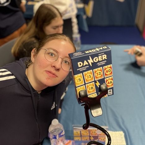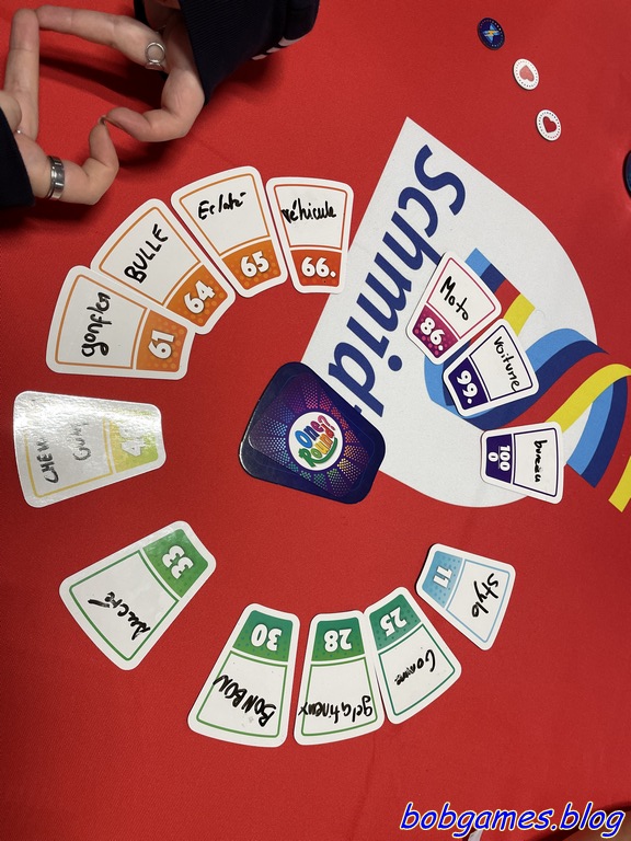 Trop de monde. On se scinde encore. Je me retrouve avec Tessa et Alana. On est 3. Un bon chiffre. Festival, à nous 4 ! On joue alors à One Round ? chez Schmidt. Un jeu d’association d’idées avec des contraintes de numéros. Si je pioche le 65 (voir photo ci-dessous), sans le montrer aux autres, je dois dire le nom d’un objet qui se situerait entre les 2 chiffres les plus proches (ici le 64 et 66) et les autres doivent deviner justement où est sa place. Facile.