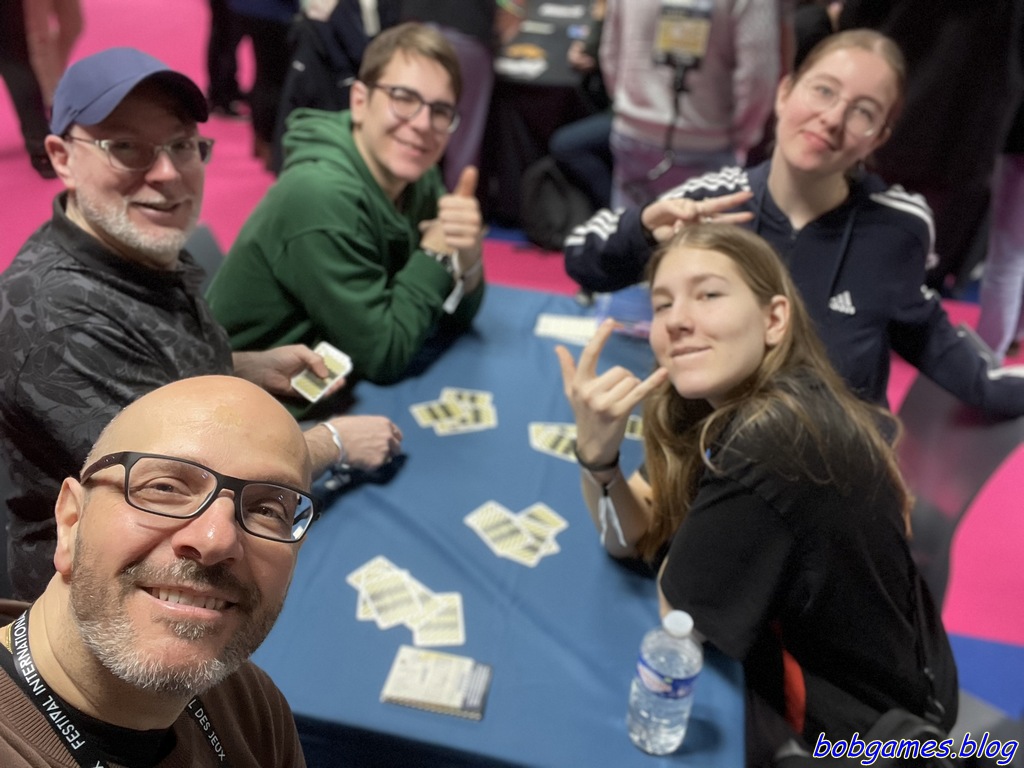 Bilan : Party game de jeu de mots original et amusant. On a aimé. Les filles ont adoré ! (elles y ont même rejoué le lendemain). Une petite demi-heure avec les règles à 5 joueurs. Pas d’achat (car c’est pas édité, sinon c’était dans la valise).