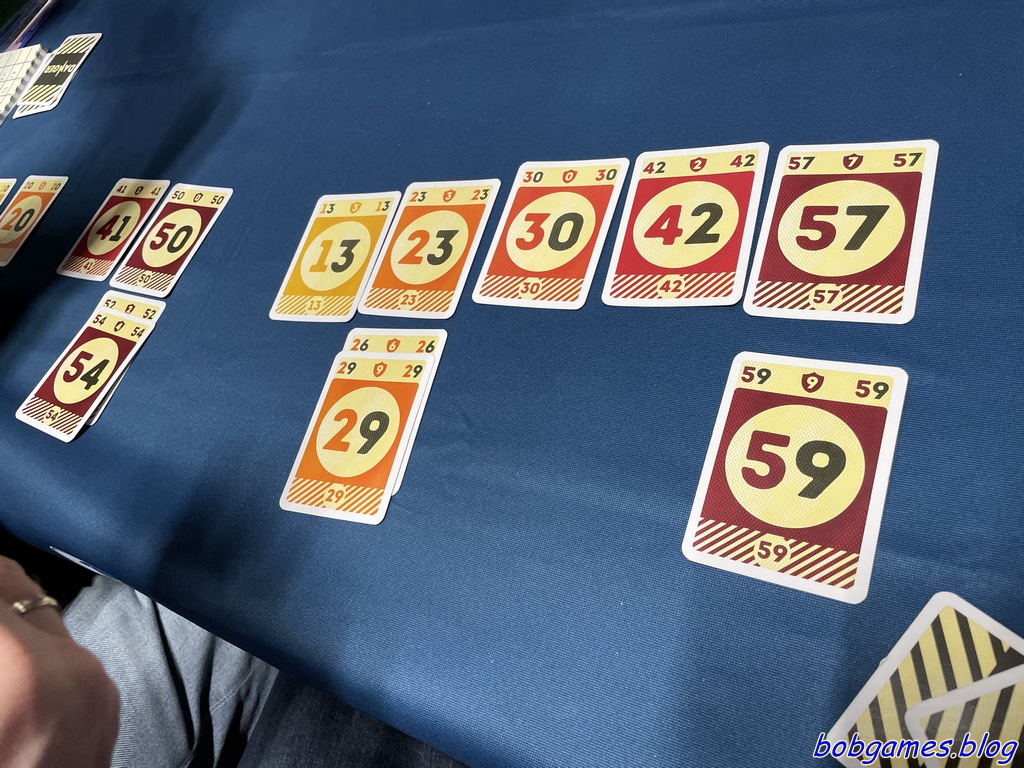 A partir de maintenant, le festival est plein. Oui. Déjà. On sait que la chasse à la table commence. On se pose chez La Boîte de Jeu pour un jeu électrique, Danger. Un jeu de plis. Chouette. Avec des cartes et des chiffres dessus. Super. Mais ces chiffres sont vraiment hauts. Oui. Ils vont de 10 à 59. Ah bon ?