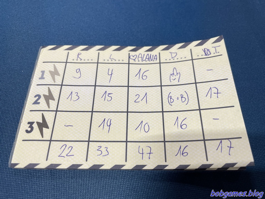 Bilan : Un jeu de plis original avec un draft en début de chaque manche pour se répartir les cartes. Un jeu plaisant mais sans grand intérêt. Je dois admettre qu’il y a un côté un peu plus créatif que les UNO-like. Vite joué, quoique… (45 minutes avec les règles à 5 joueurs). Vite oublié (de quel jeu on parle déjà ?). Victoire d’Alana. Pas d’achat (évidemment).