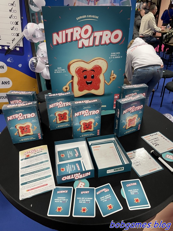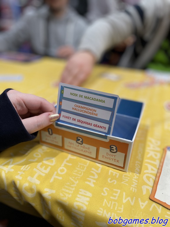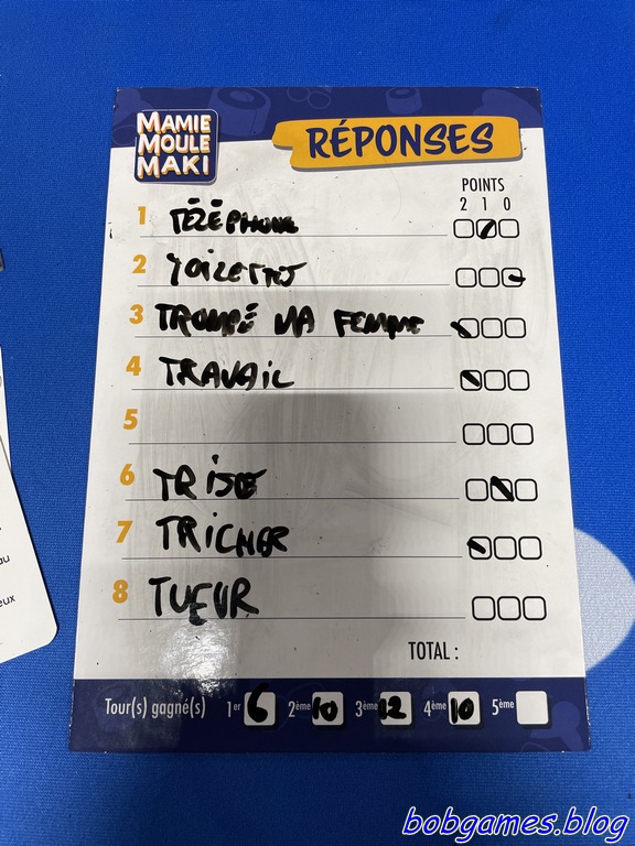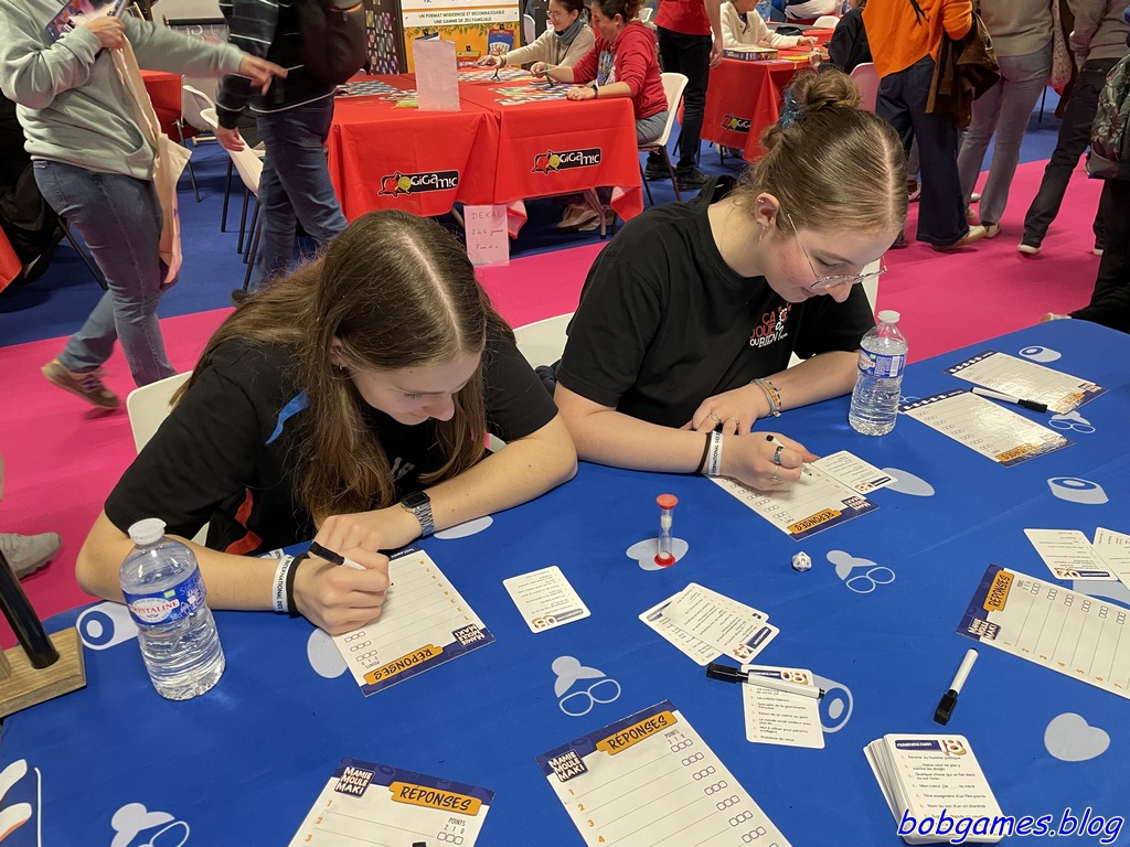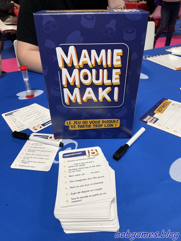 Je pars aux WC pour un besoin pressant (au passage, bravo pour les toilettes, c’est toujours propre) et je reviens retrouver les filles. Elles sont assises chez Gigamic pour tester Mamie Moule Maki. Un jeu du « petit bac » relativement classique avec un léger twist, on a 2 minutes pour remplir une série de questions en commençant par une même lettre, tirée au hasard. Ensuite, on compare entre joueurs nos réponses et on remporte 0 points si pas trouvé ou hors sujet, 1 point quand c’est pas trop mal ou qu’un autre joueur a le même mot et 2 points quand la réponse est vraiment originale. On joue en tout sur 5 manches et le vainqueur est celui avec le plus de points.