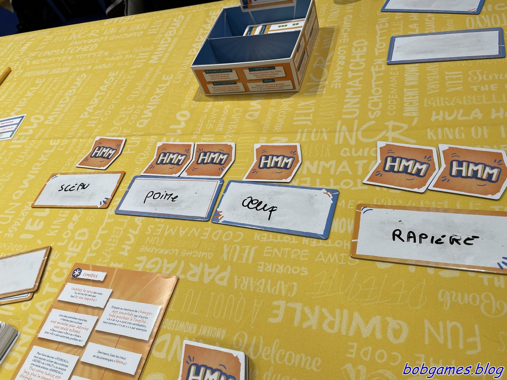 Le jeu se joue en 2 équipes qui s’affrontent mais avec la même phrase et en même temps. Il faut donc donner des indices qui vont aider les 2 équipes. Il faut avoir le cerveau en ébullition et surtout très réactif. Des tuiles HMMM représentent les syllabes et sont positionnées en début de manche pour diriger les joueurs qui devront deviner. Les joueurs qui font deviner vont poser des tuiles avec les mots indices dessus.