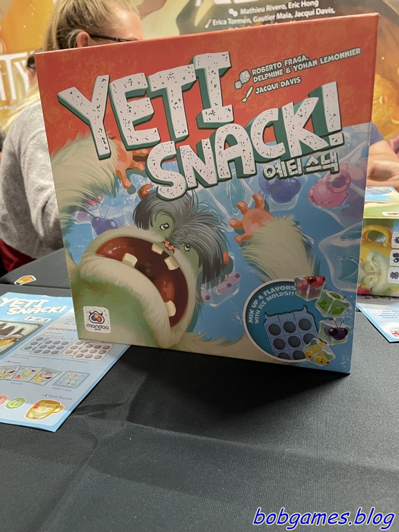 Oh une boîte rigolote avec un Yéti qui a faim, Yéti Snack, édité par Mandoo Games. Le but est de préparer des mets délicats à notre Yéti préféré mais il est franchement difficile pour manger (ça me rappelle une fille qui joue avec nous…) et il faut lui préparer uniquement ce qu’il veut. Exemple, il veut manger une banane, il faut alors plier le récipient en plastique mou jusqu’à ce que la banane soit la seule visible. Interdiction de toucher aux ingrédients avec les mains. Ça à l’air simple ? Vous ferez moins les marioles quand vous devrez faire une brochette avec les ingrédients dans un ordre précis 😀