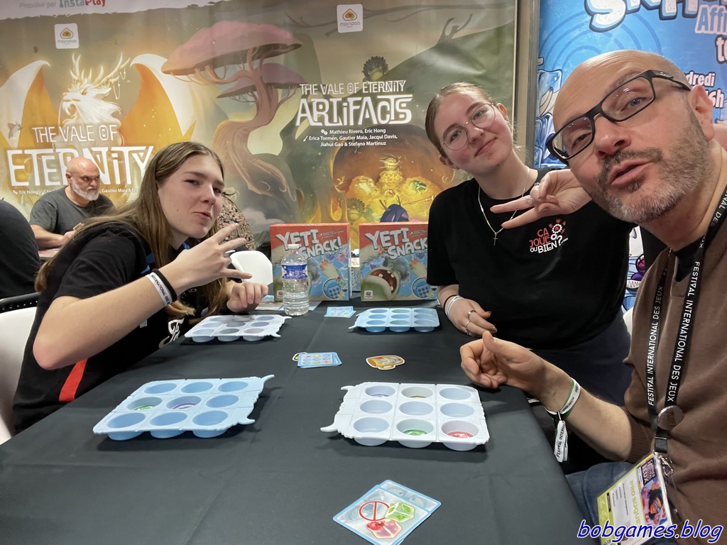 Bilan : Mais on a ri. Mais ri. C’était ludique, rigolo, tactile et la thématique juste rafraîchissante : Bon App’ Yéti !! s’amuse-t-on à crier. C’est orienté enfant mais il n’y a pas d’âge pour s’amuser. 2 parties d’environ 10 minutes. Victoire d’Alana et de moi. Pas en vente, dommage. Quand il sort, allez l’acheter. En plus, si le jeu ne vous plait plus, vous pourrez en faire des glaçons.