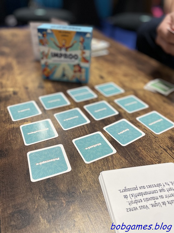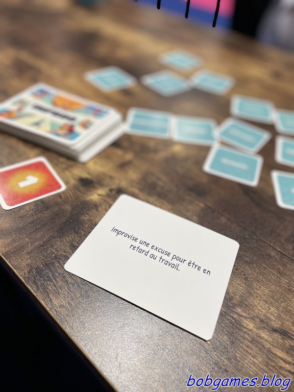 Bilan : Un vrai jeu « brise-glace » pour ceux qui sont timides et qui n’aiment pas s’extravertir. On s’est bien amusé et j’ai pu faire ressortir quelques vieilles mimiques et émotions de mon passé d’improvisateur amateur. Une petite réussite dans sa catégorie. 15 minutes de jeu avec les règles. Pas d’achat car en cours d’édition.