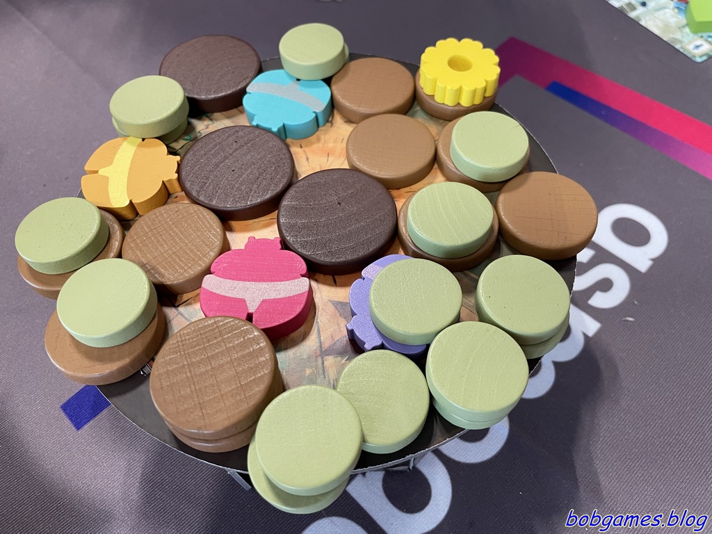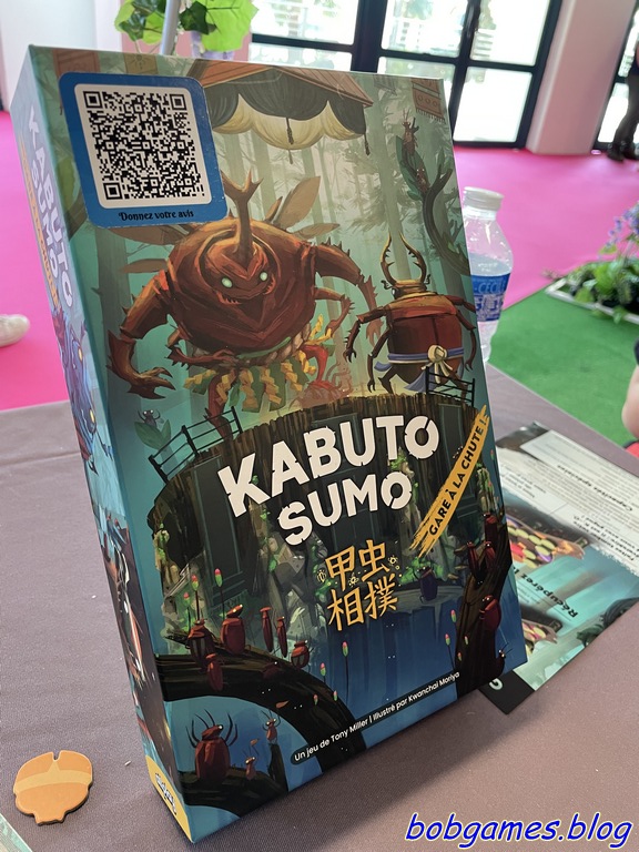 On remonte vers l’étage Asmodée et ses fenêtres lumineuses. Noé nous a rejoint. On s’installe avec Kabuto Sumo, édité chez Allplay. Un jeu pour amateur de machines à sous (coin pusher), vous savez, celles où il y a plein de pièces de monnaie et il faut en rajouter pour que d’autres (si possible plus nombreuses) tombent dans nos poches. Et bien ici c’est pareil mais avec des coléoptères virils.
