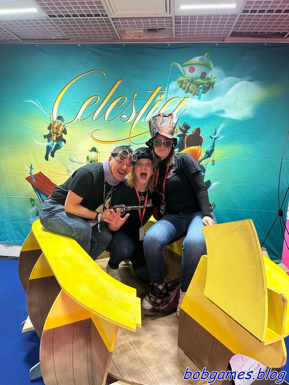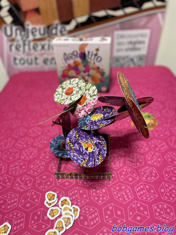 Même stand, mais un autre éditeur, ABI Games, qui nous présente Arbolito. Un jeu également pour enfants qui met notre habileté à mal dès les premières minutes. En effet, il faut faire croître un arbre en lui posant des fleurs, parfois agrémentées d’oiseaux et de… chats. Attention car une maladresse fera tomber les feuilles et évidemment on les conserve. La partie s’arrête quand toutes les feuilles de fleurs d’un joueur sont posées sur l’arbre.