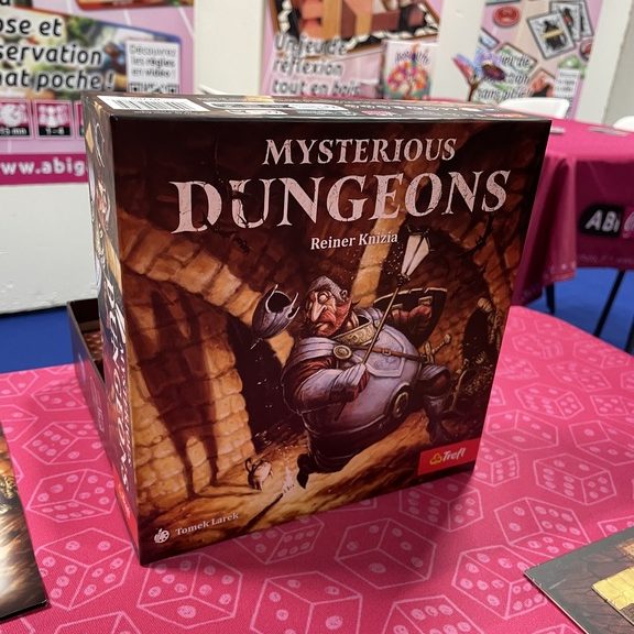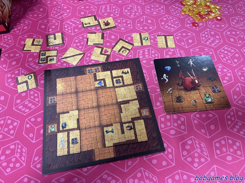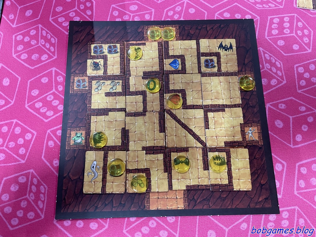 Alors le premier jeu de la journée sera Mysterious Dungeons, édité par Trefl. Une exploration de donjons où il faut poser des tuiles prises au hasard (mais tous les joueurs jouent la même tuile sur leur plateau) pour accéder aux trésors et, surtout, échapper aux monstres. Pas de règle de pose, on prend sa tuile et on la dispose où l’on veut, dans le sens que l’on veut. A la fin, on vérifie le chemin accessible depuis l’entrée et sur combien de trésors on est tombé (pastille jaune, on ajoute un point) et sur combien de monstres on a rencontré (pastille rouge, on soustrait un point).