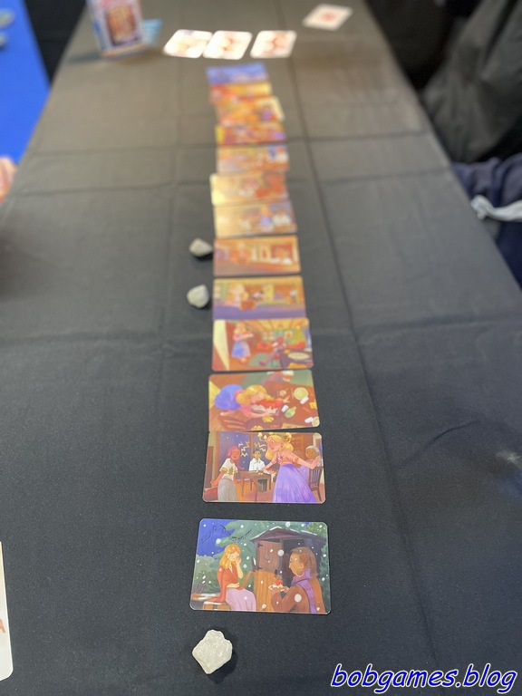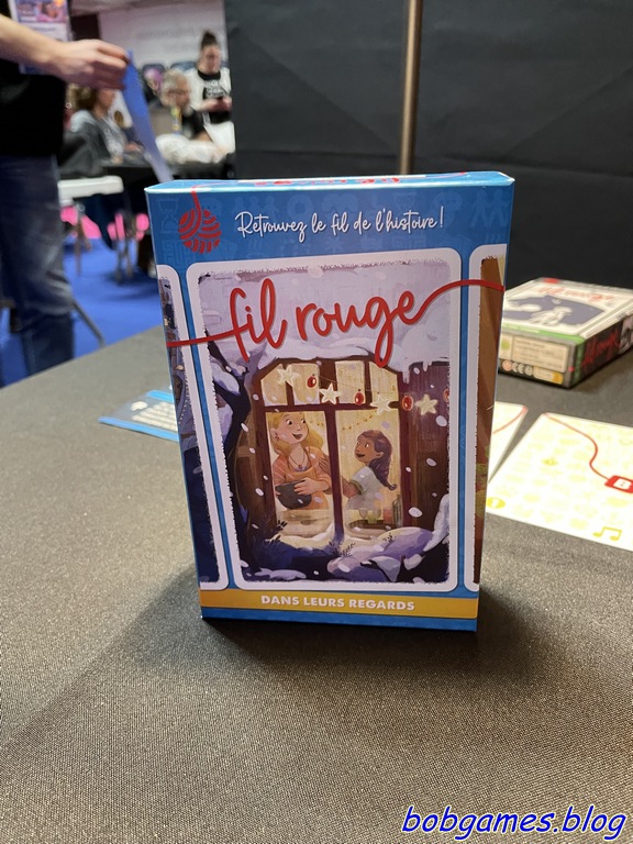 Tiens, on a pas encore joué chez Lumberjacks Studio cette année. Ils ont toujours de chouettes petits jeux. On arrive et une table se libère. Fil Rouge, une série de jeux kleenex (qui se joue une seule fois car après on connaît l’histoire) avec l’édition Dans leurs Regards. Le jeu est coopératif et nous fait analyser une série de cartes qui se veulent être une histoire. A nous de discuter pour retrouver le bon déroulé de l’histoire et poser les cartes dans le bon ordre.