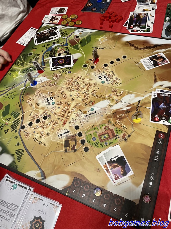 Encore un coopératif ou l’on doit collaborer pour vaincre les soldats du Gouverneur Prizerio (el méchanto). Chacun de nous dispose de cartes d’attaque uniques qu’on peut utiliser de manière stratégique pour éliminer les ennemis (en gros, c’est oune dek-buldingo). Le jeu repose vraiment sur la discussion et la coopération, car c’est ensemble qu’on devra planifier nos actions pour être efficaces. Pendant les phases de jour, on peut se rendre au marché pour acheter de l’équipement qui renforcera nos attaques et nous permettra de mieux gérer les différentes situations. Mais le plus important est d’aller converser et écouter les ragots qui circulent au village (encore una tequila ?!), pour savoir de quelles routes viendront les menaces. Plus on écoute, plus on découvre d’informations cruciales, mais moins on a le temps de s’équiper dignement. Encore un jeu où il faut faire des choix.