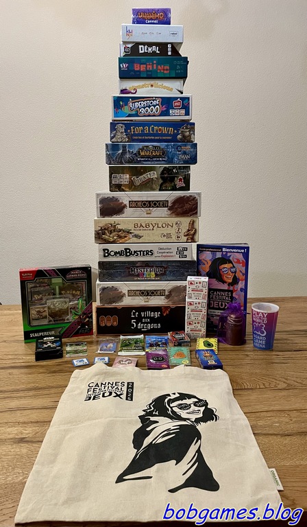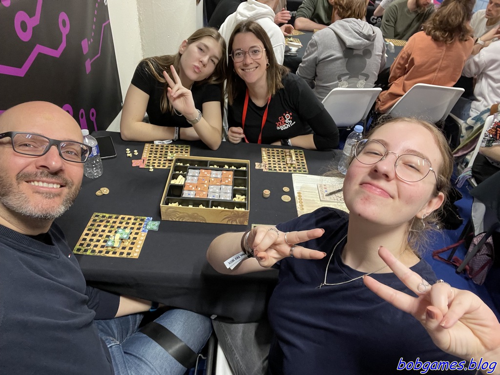 Bilan : C’est beau, c’est frais, c’est jouissif de voir sa création prendre forme et c’est relativement simple. C’est aussi un jeu « dans sa mangeoire », à savoir qu’on va pas ou peu regarder ce que font les autres joueurs. Le jeu est aussi plus stratégique que l’on croit si on arrive à anticiper ce que l’on veut développer (genre arriver à un 4ème étage avec un escalier). Super. Bravo. Partie en 1h20 avec les règles à 4 joueurs. Victoire de Marion, exæquo de points avec Alana. Achat avec dédicace de l’auteur.
