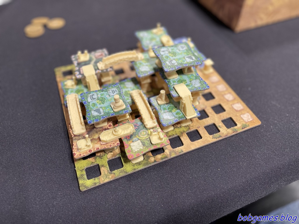 Des règles simples mais avec plusieurs petites spécificités : à son tour, on commence par creuser, à savoir par prendre une tuile qui va nous donner un stock de matériau (piliers simples ou doubles, belvédères, escaliers, fontaines, statues ou ponts) ; ensuite on peut utiliser cette tuile et les matériaux pour construire un étage supplémentaires et des éléments de décor ; enfin, on défausse ce qu’il nous reste à l’exception d’un pilier. Evidemment, les règles de pose sont alambiquées mais vite comprises, ça devient fluide dès le deuxième tour. On va jouer ainsi jusqu’à la fin des tuiles à creuser et on compte la salade de points de nos jardins.