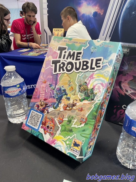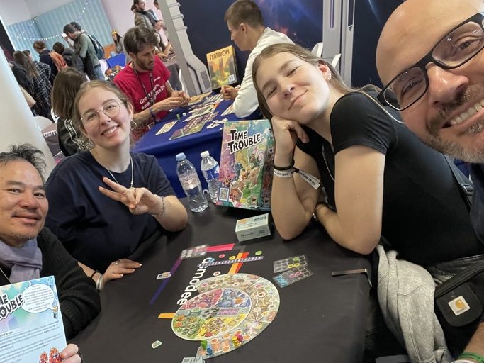 Dernier jeu de ce FIJ. On joue à Time Trouble chez Hans im Gluck. A la table : Alana, Tessa, Minh et votre humble serviteur. On finira avec un jeu coopératif (tiens, encore) aux dessins colorés et fantaisistes. Attrape les Fluffies qui foutent le bordel et sauve le temps ! Oui, c’est le but du jeu. On doit guider quatre personnages à travers différentes époques, en superposant des cartes transparentes. Chaque niveau te balance dans une époque différente avec de nouveaux défis, mais le truc, c’est que tu n’as que 40 secondes pour agir à chaque manche. Alors faut vraiment s’organiser (et sans dévoiler nos cartes), utiliser les pouvoirs des persos et bosser ensemble avant que le temps nous submerge.