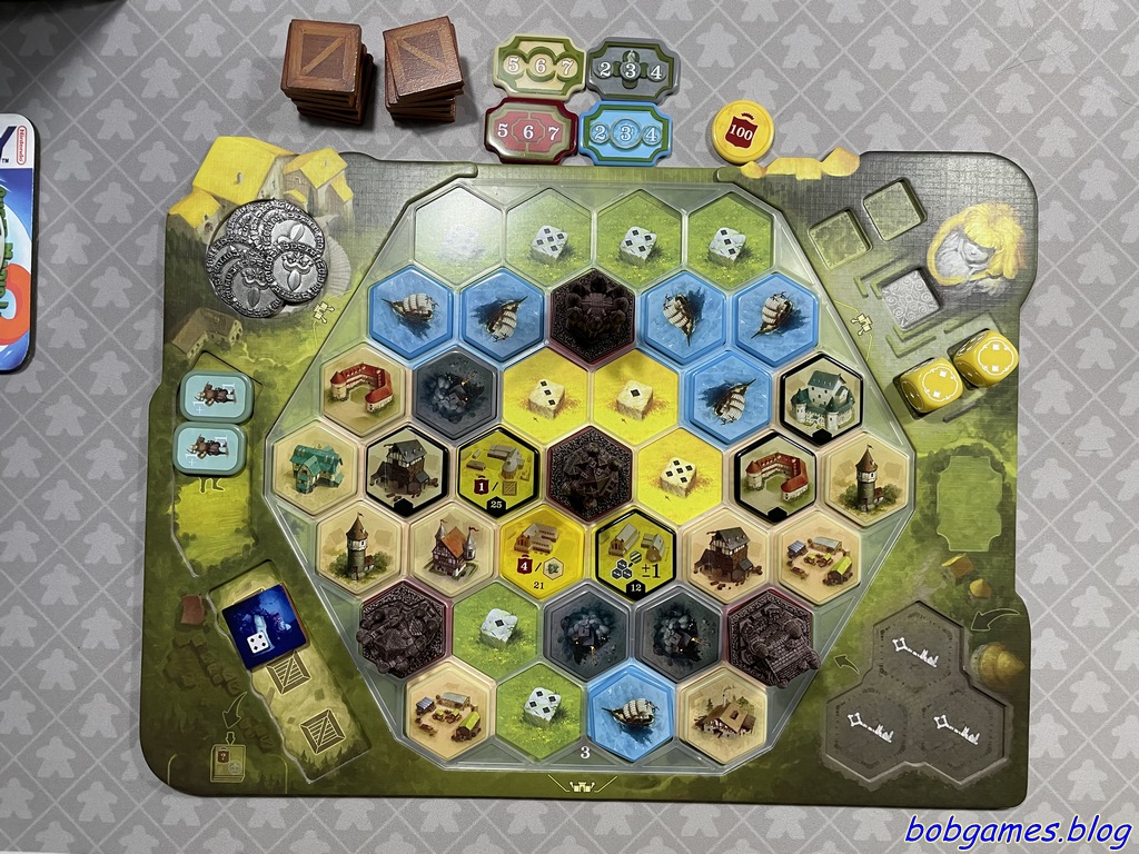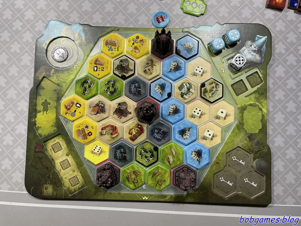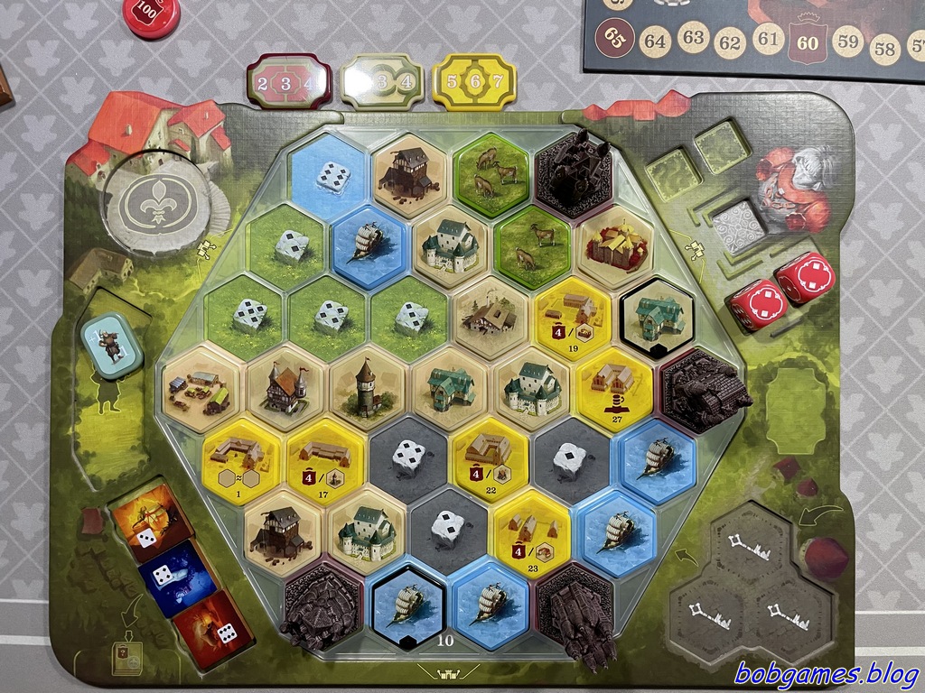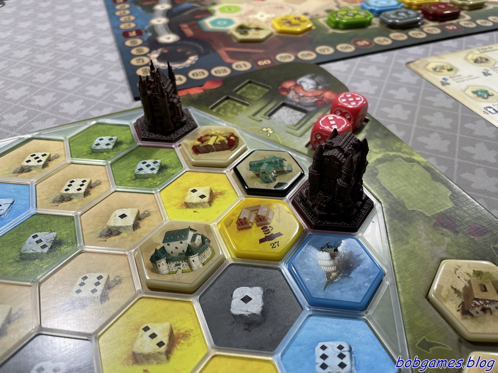 Les Châteaux de Bourgogne, quoi encore ?! Oui. Ce jeu est beau (quoique ça dépend quelle version). Ce jeu est bon. Les Châteaux de Bourgogne, c’est le genre de jeu qui te fait aimer poser un hexagone comme si tu étais en train de bâtir une cathédrale. T’as un matériel tout pété (dans sa version remastérisée par Awaken Realms) et le cerveau tourne comme une montre suisse. A chaque tour, après avoir pesté contre ton lancer de dés, tu as l’impression de faire un coup de génie alors que t’as juste pris un cochon ou posé une mine. Grandiose.