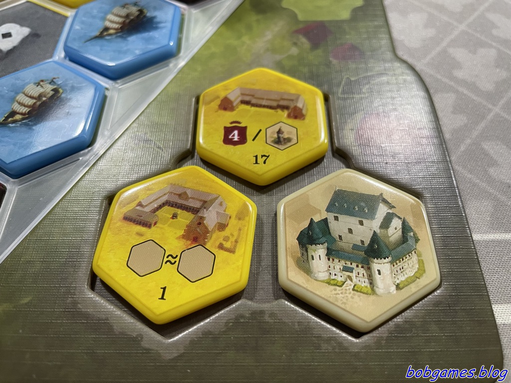 Les tuiles jaunes sont importantess : elles permettent non seulement de prendre des actions puissantes, permettant de gagner quelques bonus et ressources par ci par là, mais certaines d’entre elles rapportent aussi des points de victoire en fin de partie.