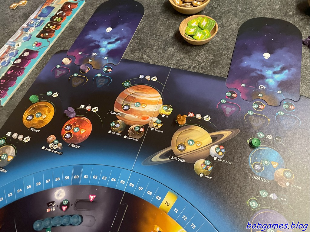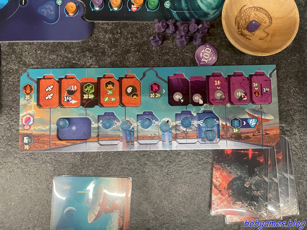 Le plateau principal est composé du système solaire et des galaxies lointaines, très lointaines. On y trouve aussi l’ensemble des planètes du système solaire (et leurs lunes) en détail, permettant à nos sondes de se mette en orbite ou d’atterrir. Il y a également les 3 différents signaux qui peuvent nous apporter la preuve d’une vie extraterrestre. Enfin, dans SETI, on peut trouver 2 races extraterrestres (tirées au hasard sur un total de 5 races). Les signaux sont : les traces par le « bruit » spatial (qu’on trouve en scannant), les traces par l’exploration des planètes (en posant des sondes dessus) et les traces par analyses de données (en récoltant de la data un peu partout).