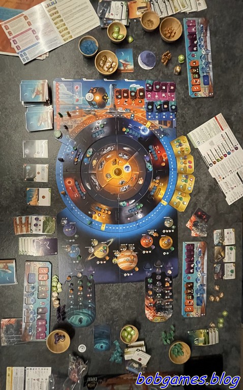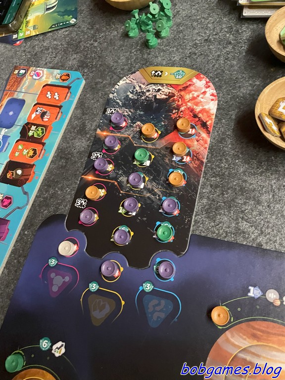 En fin de partie, on procède au décompte final : les cartes « fin de partie », les tuiles « Score » dorées (dont je n’ai pas parlé ici mais qui sont une petite course aux objectifs les plus rentables, une sorte de paris pour la fin de partie) et les éventuels points attribués par les races extraterrestres.