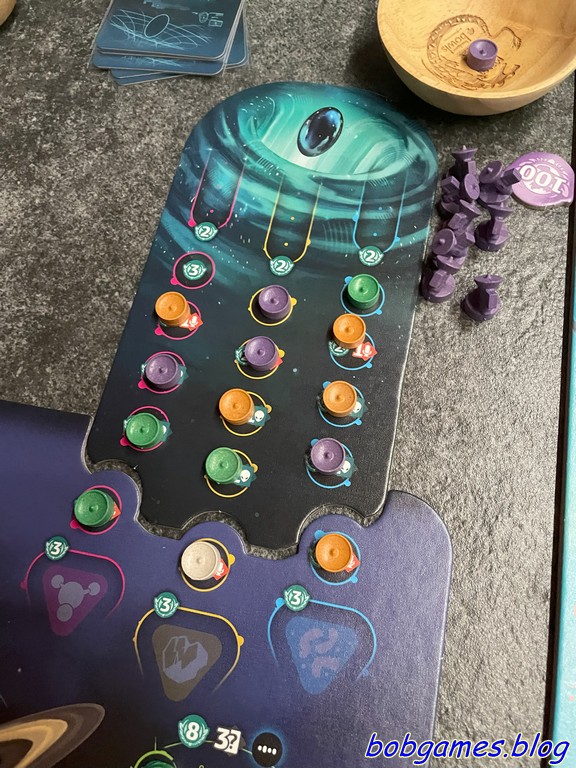 Le cœur du jeu est clairement le bon usage des cartes, il y en a avec des bonus à usage unique, d’autres avec des missions à accomplir et encore d’autres qui sont à des usages de fin de partie. Rester à court de cartes ne sera pas une bonne idée, encore faut-il avoir les ressources nécessaires pour les payer…