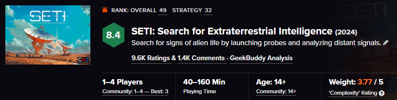 Oui, on termine cette saison 10 par un autre jeu avec une thématique forte de l’espace. SETI : Recherche d’Intelligence Extraterrestre est un jeu de Tomáš Holek, francisé par Iello. SETI ? Le programme SETI (Search for Extraterrestrial Intelligence) est une initiative scientifique qui cherche à détecter des signaux provenant de civilisations extraterrestres en analysant les ondes radio et autres formes de communication émanant de l’espace. Et c’est ce que nous allons faire dans ce jeu, scanner le système solaire / l’univers et envoyer des sondes spatiales sur des planètes (un peu comme le programme Voyager). Notre seul objectif (à part gagner bien sûr) ? découvrir des traces d’extraterrestres et tenter de communiquer avec eux.