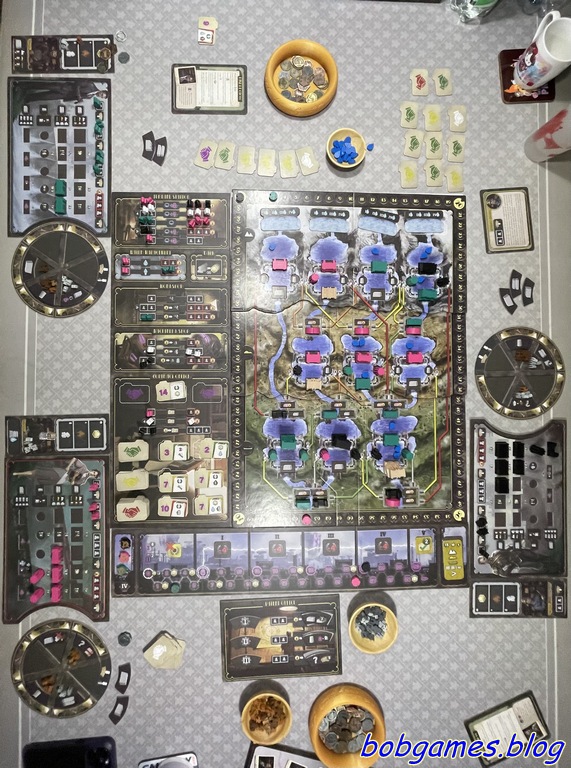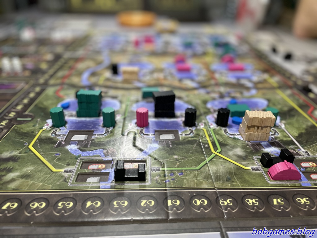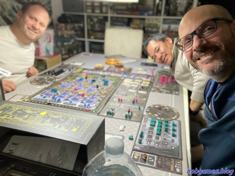 Barrage. Ou cette scène improbable où trois joueurs souriants cachent trois histoires très différentes. Tchi, lancé comme une crue soudaine, finit dignement à 100 points. Minh qui râle du début à la fin, persuadé que son « personnage » vaut moins qu’une goutte perdue dans une canalisation (et ses 64 points confortent son diagnostic, mais quel visionnaire !). Et puis il y a Bob, qui avance tranquille tranquille, érige ses bâtiments comme un magnat new-yorkais qui choisirait l’emplacement d’un futur gratte-ciel et qui termine à 103 points (désolé Tchi), avec le calme de celui qui pilotait la vallée depuis le début.