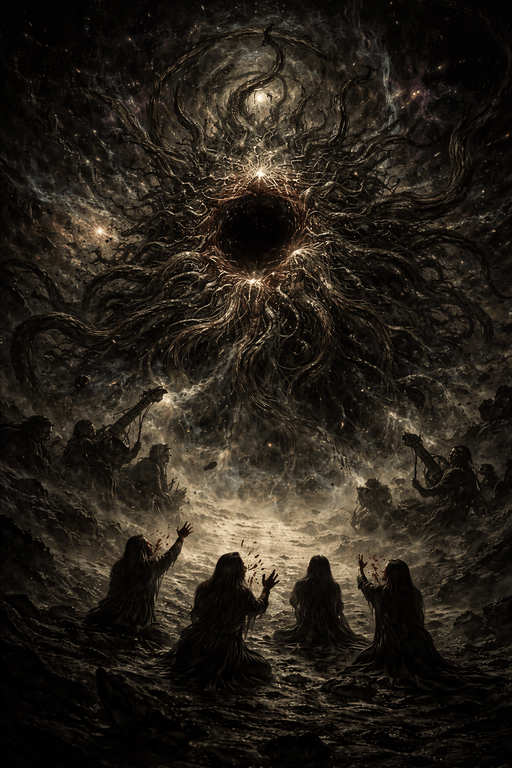 « Dans le noir sans bords, dans le sommeil du monde, Sa faim respire. Écoutez le tambour sans mains, le rythme sans cœur, la pulsation de l’absence. Les étoiles se taisent une à une, non par pudeur, mais parce qu’elles comprennent. Nous ne prions pas. Nous nous effaçons. Nous devenons l’ombre d’une pensée qui n’a jamais été la nôtre. Car Il vient. Il a toujours été là. Azathoth, vaste et aveugle, noyau du hurlement, ventre du chaos. Que nos noms soient dissous, que nos mémoires s’éteignent, que nos os apprennent la musique impossible. Que les portes de la raison se fendent comme verre trop froid. Que les yeux qui voient se ferment, et que ceux qui rêvent se mettent à saigner des constellations. Nous chantons pour l’innommable, nous pleurons pour l’inévitable, nous rions pour l’absolu. Qu’il avance sans marcher, qu’il règne sans comprendre, qu’il dévore sans vouloir. Que le monde cède, que la chair s’incline, que le temps déraille. Et quand les flûtes sans souffle commenceront, quand le ciel oubliera sa forme, alors seulement, alors enfin nous serons dignes de ne plus exister ».