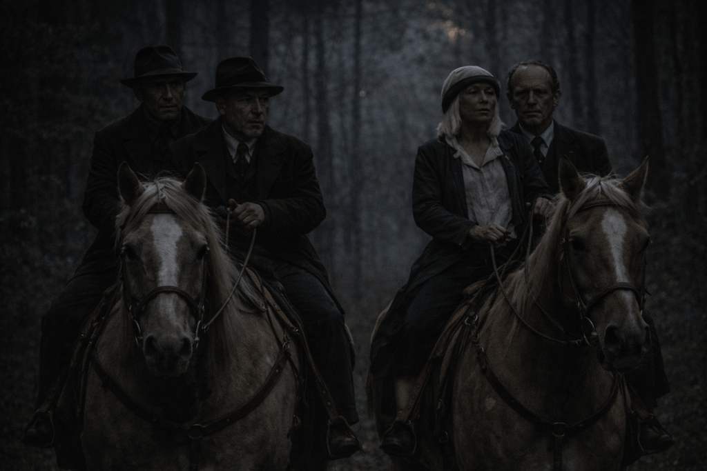 Elle affirme qu’ils savent pour les Sasquatchs. Qu’ils vont partir là-bas chercher la pierre verte. Et elle veut partir aussi, tout de suite, malgré son état, malgré tout. Une urgence fébrile, pas héroïque, plutôt une certitude qu’attendre reviendrait à mourir autrement. On lui fait avaler un peu de bouillon. Elle mange comme une enfant malade, lentement, en retenant sa propre nausée. Elle s’habille. Personne ne discute longtemps. Dans ce genre de nuit, les débats n’existent pas. On part à cheval. Deux chevaux seulement pour quatre personnes. Alors on monte à deux. Dans le noir du Montana, serrés, armés, épuisés, et déjà rattrapés par l’idée que le pire n’est pas derrière nous, mais qu’il nous attend là où la forêt devient plus ancienne, plus dense, plus étrangère.