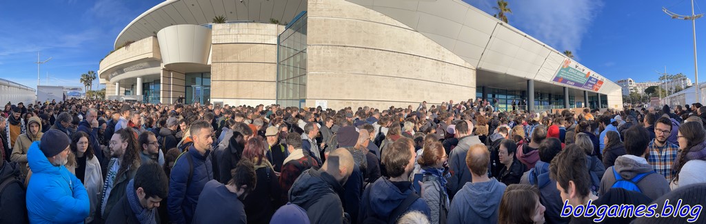 Vendredi 28 février 2025, 7h44. L’aube dorée éclaire la Croisette et, déjà, une marée de passionnés se presse devant le Palais des Festivals. Ici, l’attente est comme un jeu : certains battent les cartes de la patience, d’autres lancent des dés invisibles pour savoir qui trouvera la meilleure table en premier. Les stratèges affûtent leur plan d’attaque, les deck-builders empilent mana sur mana et les experts en placement optimisent chaque mètre carré de trottoir. Oui, c’est le grand jour, le jour de l’équation ludique « Badges Pros + Pass Privilège + Billets publics = Grosse foule ». Dans cette foule, pas de perdants, juste des joueurs prêts à tirer la meilleure carte de la journée : une entrée tant attendue dans le temple du jeu (et quelques frustrations quand même quand la table convoitée est déjà prise… oui).