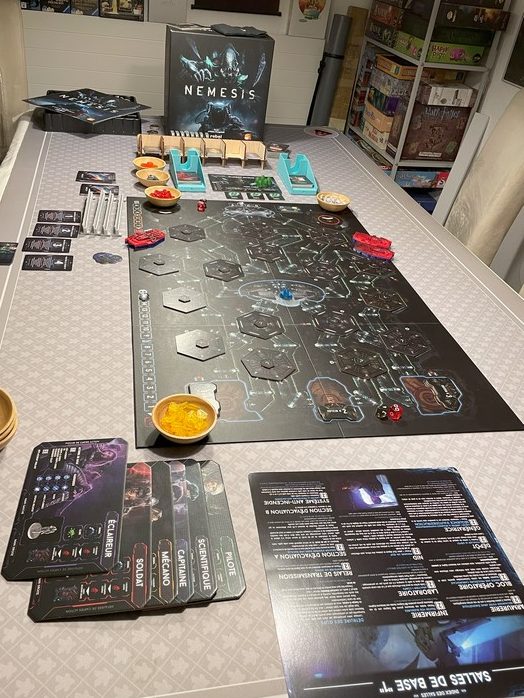 Nemesis se déroule dans un vaisseau spatial en perdition, infesté d’extraterrestres hostiles. On ne peut pas les appeler Alien pour des questions de droits, mais c’est clairement inspiré de cette merveilleuse saga. Chaque joueur incarne un membre d’équipage, avec ses propres objectifs secrets. L’objectif principal est de survivre et de s’échapper vivant du vaisseau… Qui de Bob, Minh, Stefano ou Stéphane y est parvenu ? Réponse en 8 photos.